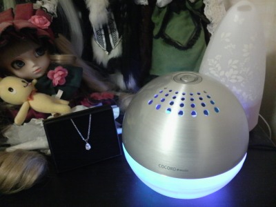 画像の丸くて光ってるのが空気清浄機。光りながら中で水が回転してるので綺麗です。